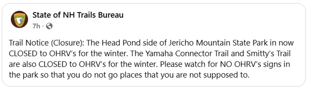 Know BEFORE you go, you should always check trail updates by visiting https://www.nhstateparks.org/find-parks-trails/find-trails-maps-clubs/trail-advisories-and-closures